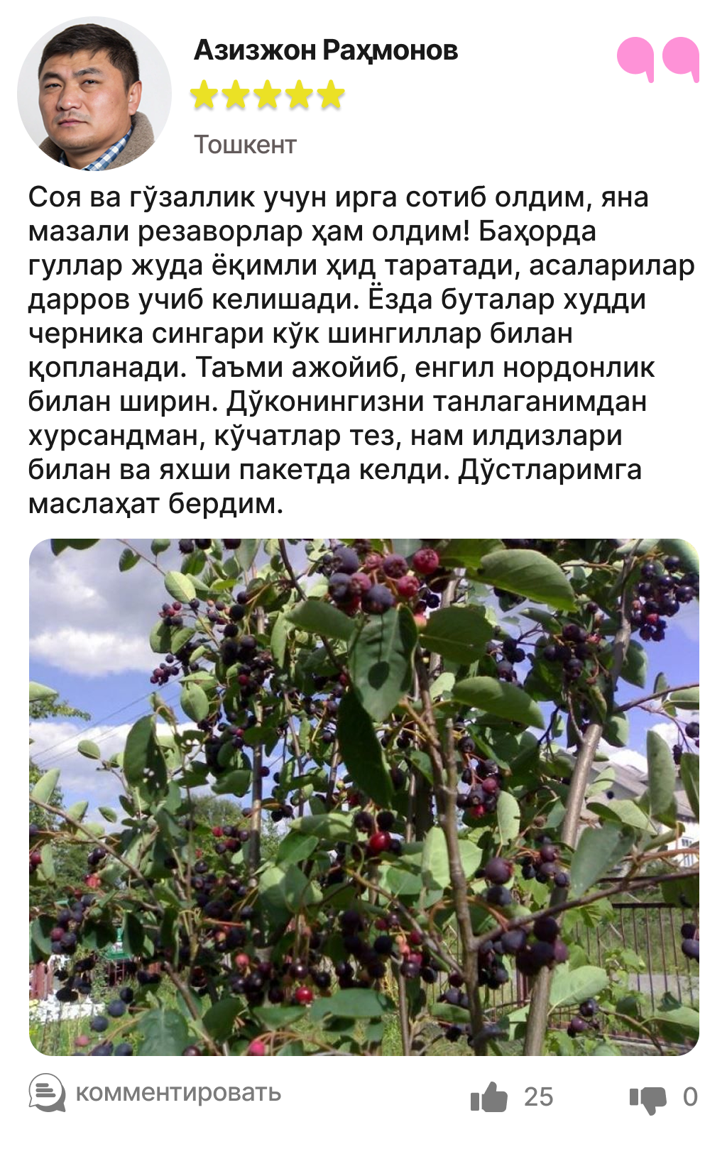 Харидорларимиз сотиб олинган ва етиштирилган ирга кўчатлари ҳақидаги таассуротлари билан ўртоқлашмоқда.